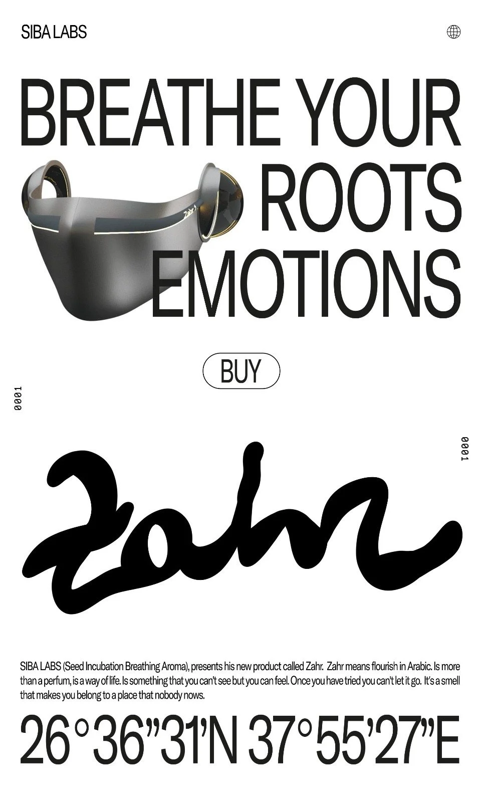 Zahr is born from a futuristic hypothesis where humanity has polluted the planet to the point that even breathing has become hazardous, wiping out much of the animal and plant species in our ecosystem, along with their scents. Technology, both the cause of this disaster and the means of survival within it, forces people to endure rather than live fully. In this catastrophic context, where masks are necessary to shield from pollution, Zahr emerges as the fragrance of this dystopian future, offering a chance to reclaim the lost emotions associated with scents.